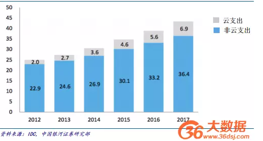 2012 年,我国云计算支出为 20 亿美元, 2013 年约为 27 亿美元,根据 IDC 的预测,中国云计算的支出将在2017 年达到 69