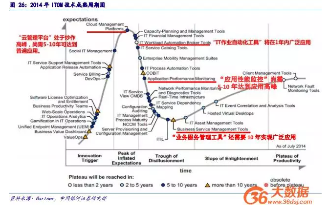 云运维市场尚处蓝海,市场需求缺口已形成,但技术成熟、市场稳定仍需时间。 根据Gartner 针对 2014 年 7 月发布的 ITOM( IT