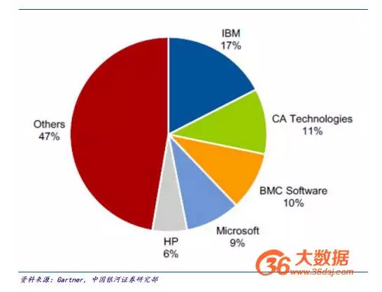 2013 年全球 ITOM 软件收入的市场份额可以看出,IBM、 CA、 BMC 保持领先地位, 微软和惠普紧跟其后, 前五名的市场份额之和占到整个 ITOM 软件市场的 53%。